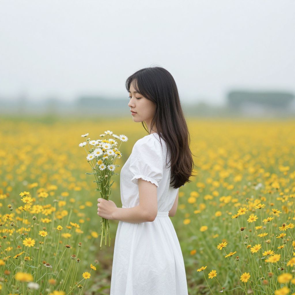 Photograph of an Asian woman with long, straight black hair, wearing a simple white, short-sleeved dress, standing in a vast field of yellow dandelions and white daisies. She holds a small bouquet of white daisies in her right hand, facing left with a serene expression. The background is a blurry expanse of yellow flowers and green stems, with a pale, overcast sky above. The image exudes a peaceful, natural, and pastoral atmosphere.