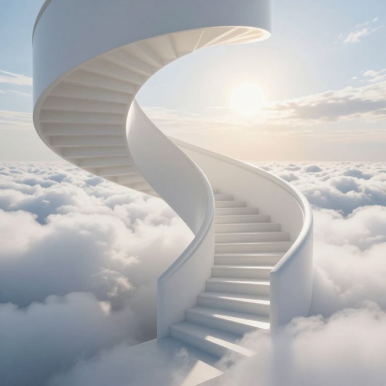 Spiraling staircase ascends through ethereal clouds, its pristine white steps vanishing into a radiant sky illuminated by a distant sun, evoking a sense of infinite ascent and transcendence.