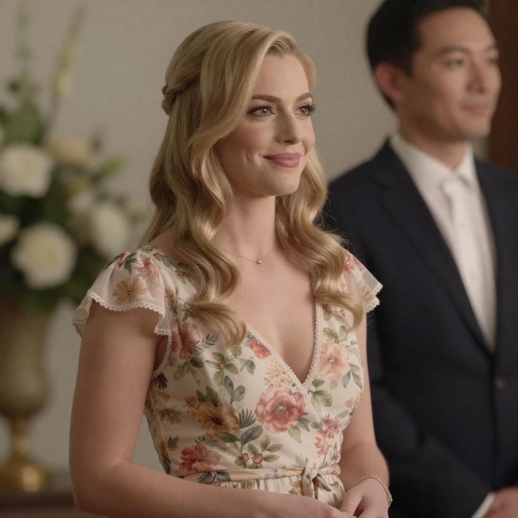 Photograph of a blonde woman with wavy hair, wearing a floral dress, hands clasped in front of her smiling softly. She stands beside a man in a dark suit, blurred in the background. Soft, warm lighting highlights her face. White flowers are visible in the background.