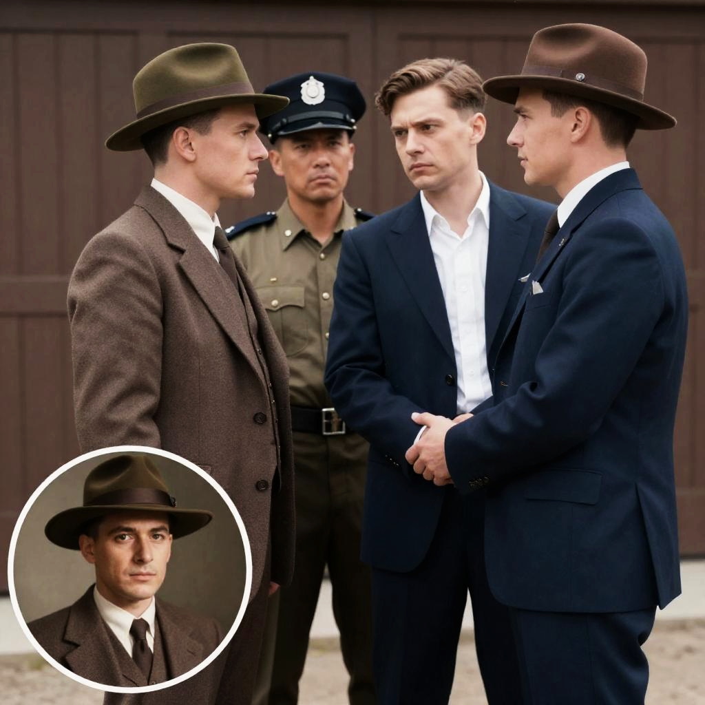 Photograph of three men in 1930s-style suits, standing outside a building. Central man with dark hair, grey suit, black tie, adjusting his tie. Left man with light grey suit, white shirt. Right man with brown suit, black bowler hat, smiling. Central man's expression is slightly serious. Background includes a white column and tree.