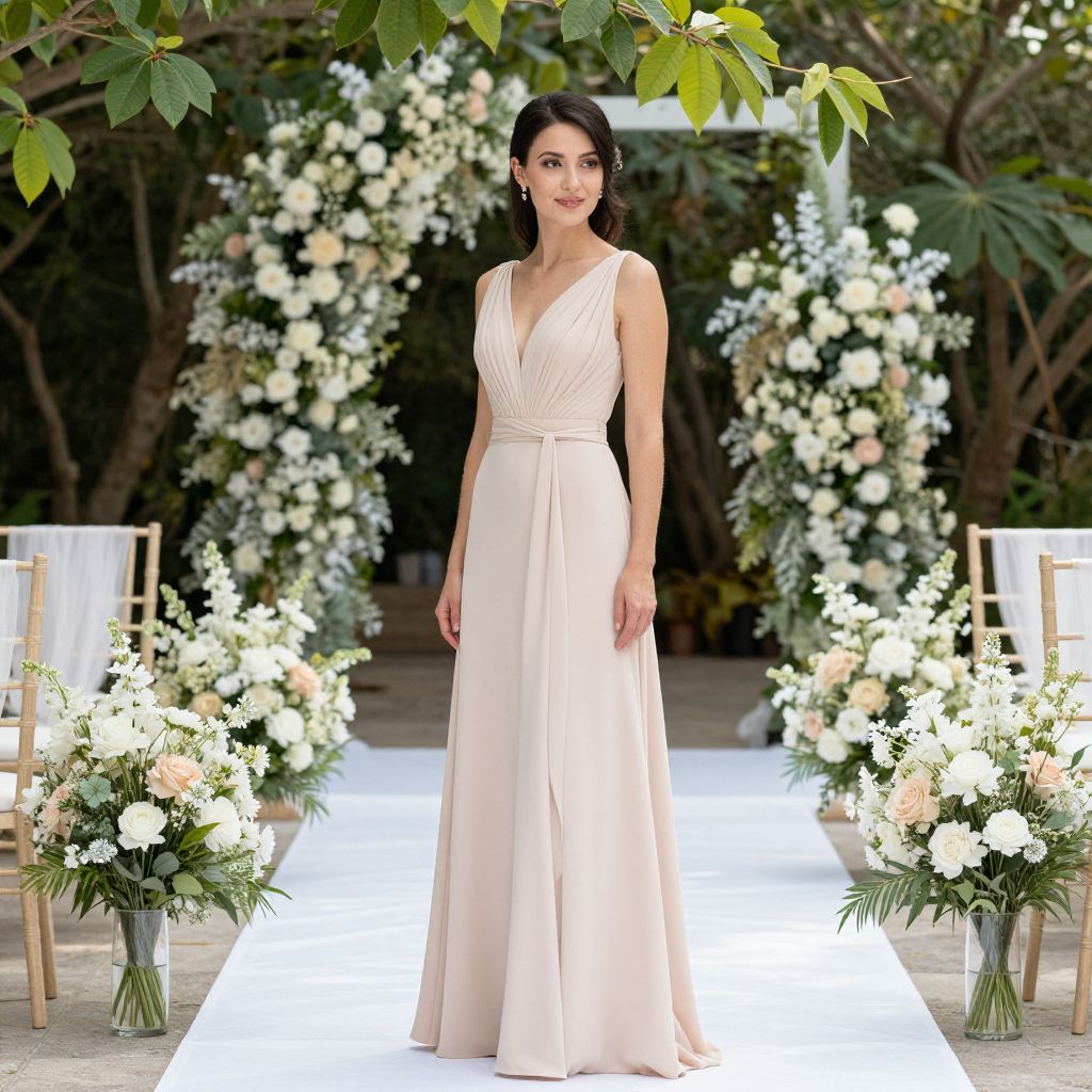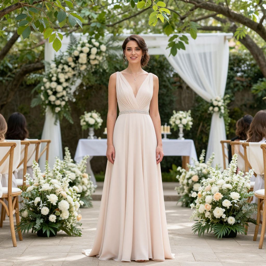 Elegance whispers through the air as a woman in a blush gown stands amidst a meticulously arranged outdoor wedding setting, where the soft rustle of leaves, the gentle fragrance of blooming flowers, and the promise of celebration intertwine in a moment of serene anticipation.