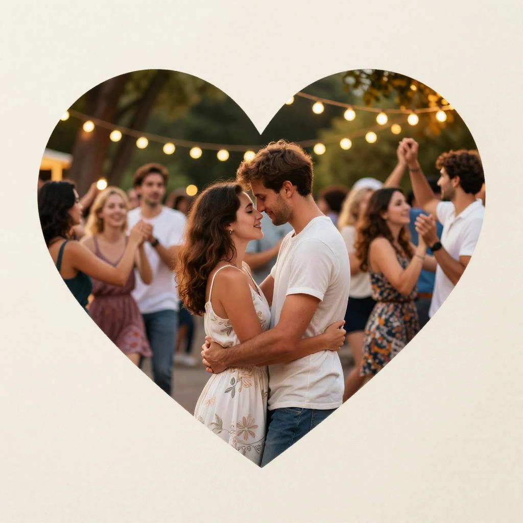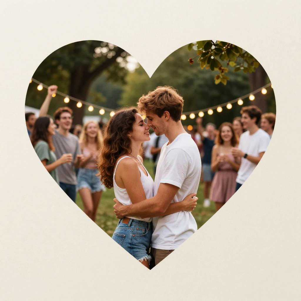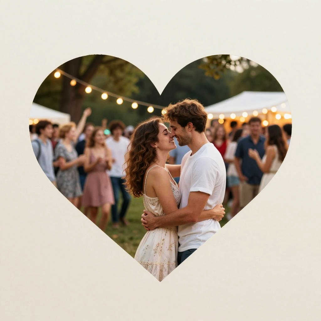 Heart two young Partners in love embracing intimately in a romantic setting. City park jazz night. Trees with party lights, party in the park. Summer vibes. Paper art. Off-white paper edges. Vivid colors.