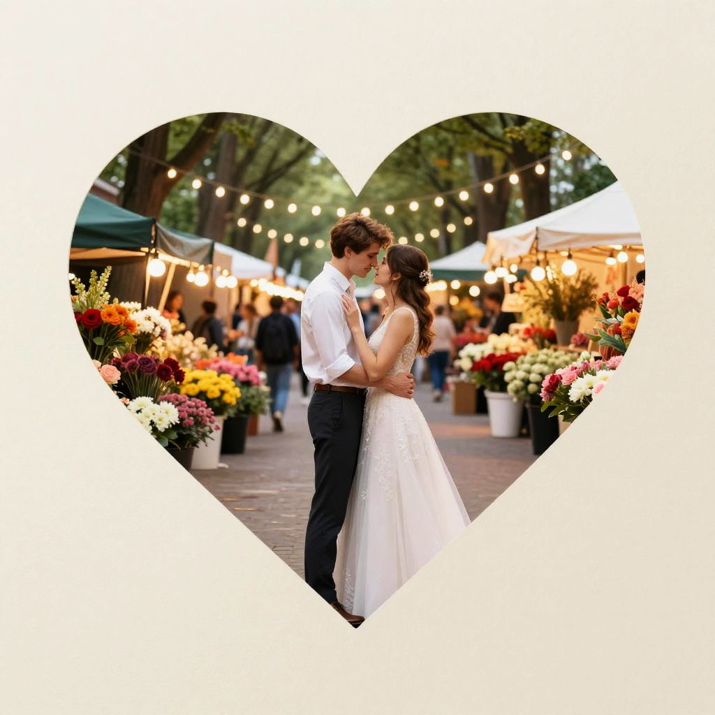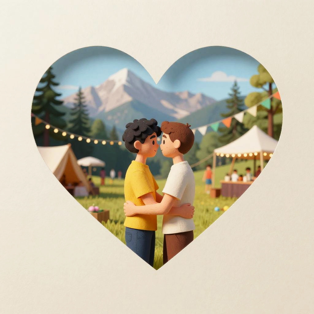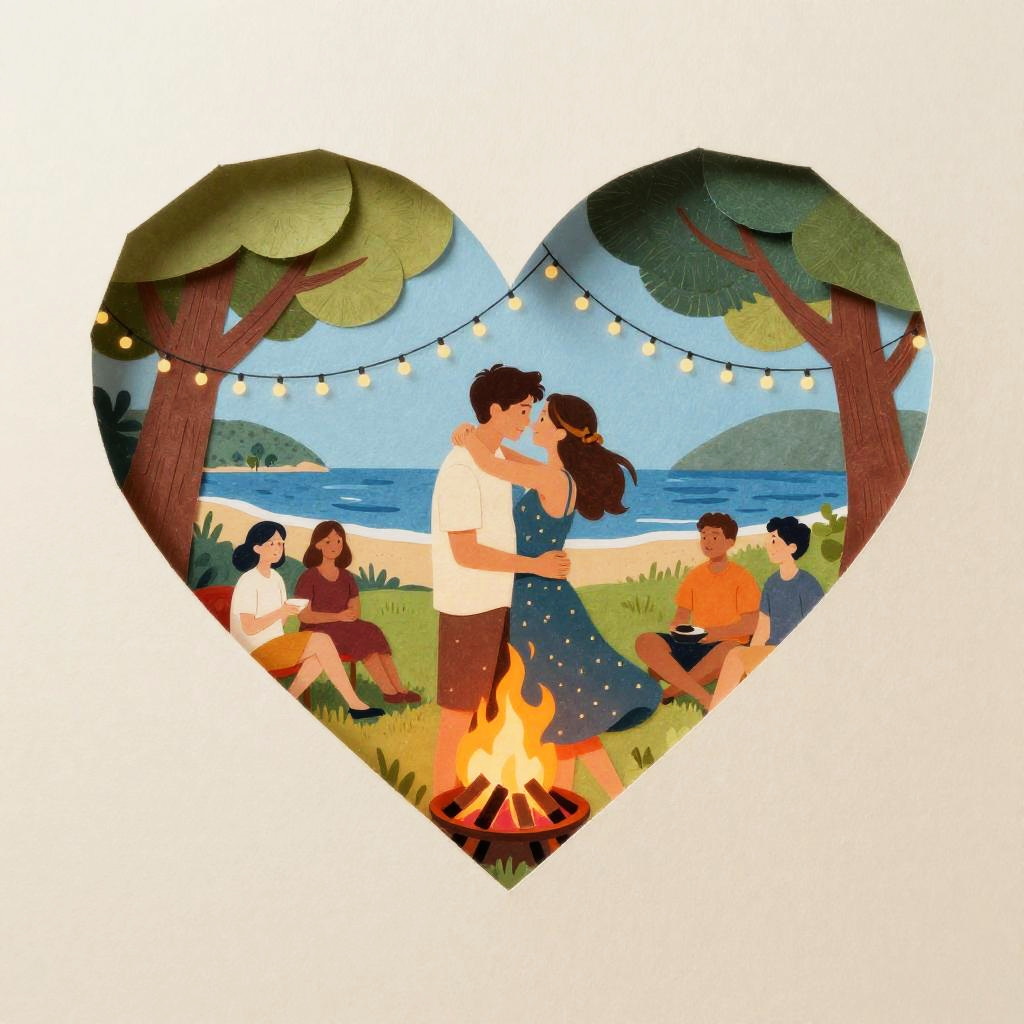 Heart two young Partners in love embracing intimately in a romantic setting. City park jazz night. Trees with party lights, party in the park. Summer vibes. Paper art. Off-white paper edges. Vivid colors.