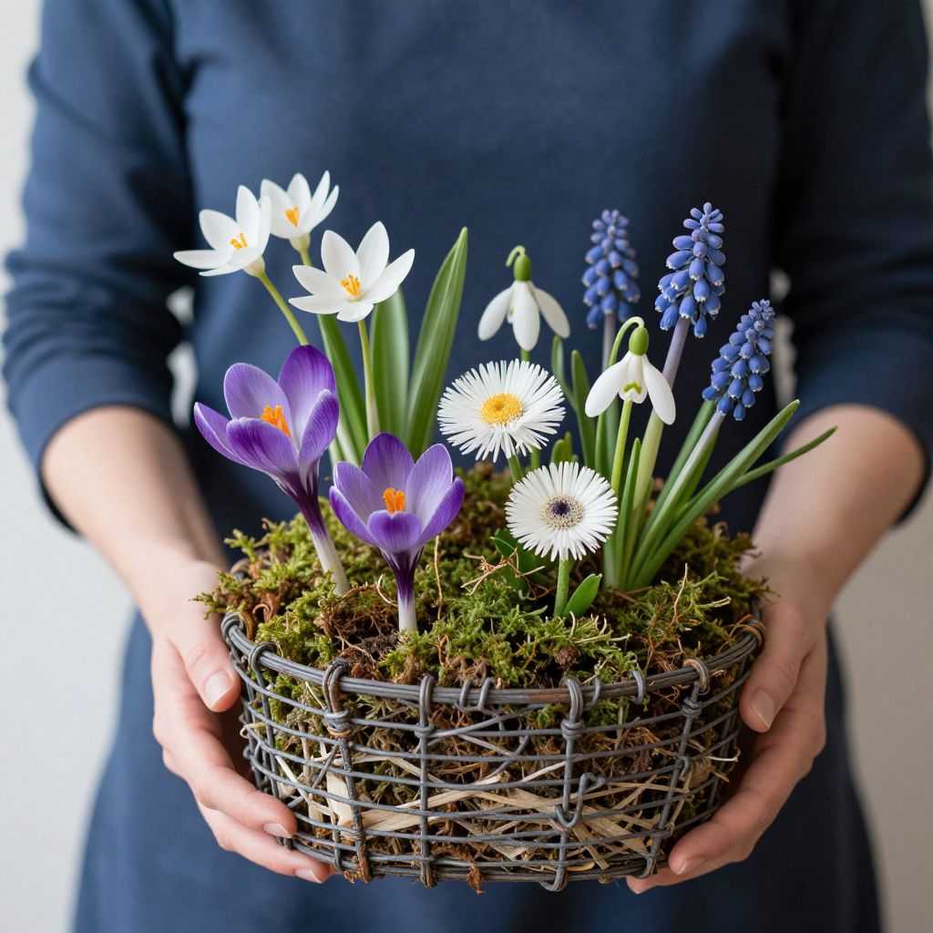 Woman delicately holds a rustic wire-woven basket filled with vibrant spring blooms, including star-of-Bethlehem, crocus, bellis, snowdrop, and grape hyacinth, all nestled among lush green moss.