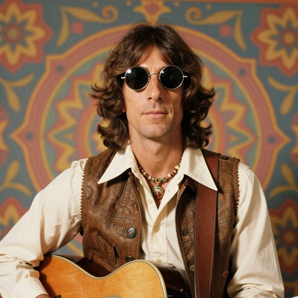 George Harrison hippie style portrait, 1960s psychedelic background, vibrant colors, floral patterns, vintage guitar, peaceful expression, iconic round sunglasses, detailed, artistic
