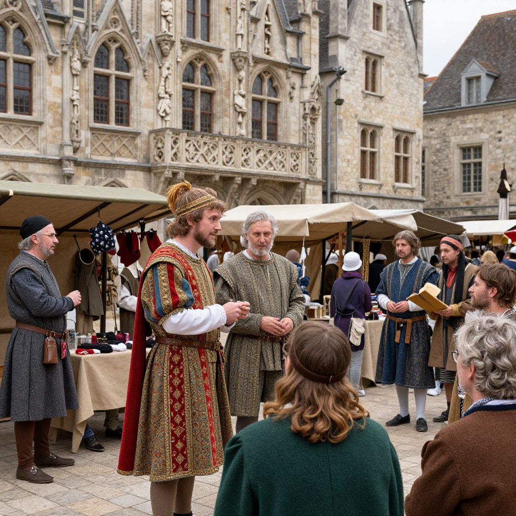 Photograph of medieval market scene with knights in ornate tunics and hats, stone buildings, and market stalls in background.
