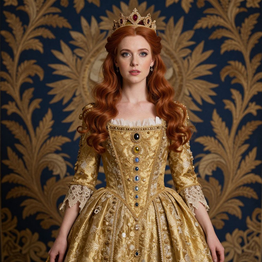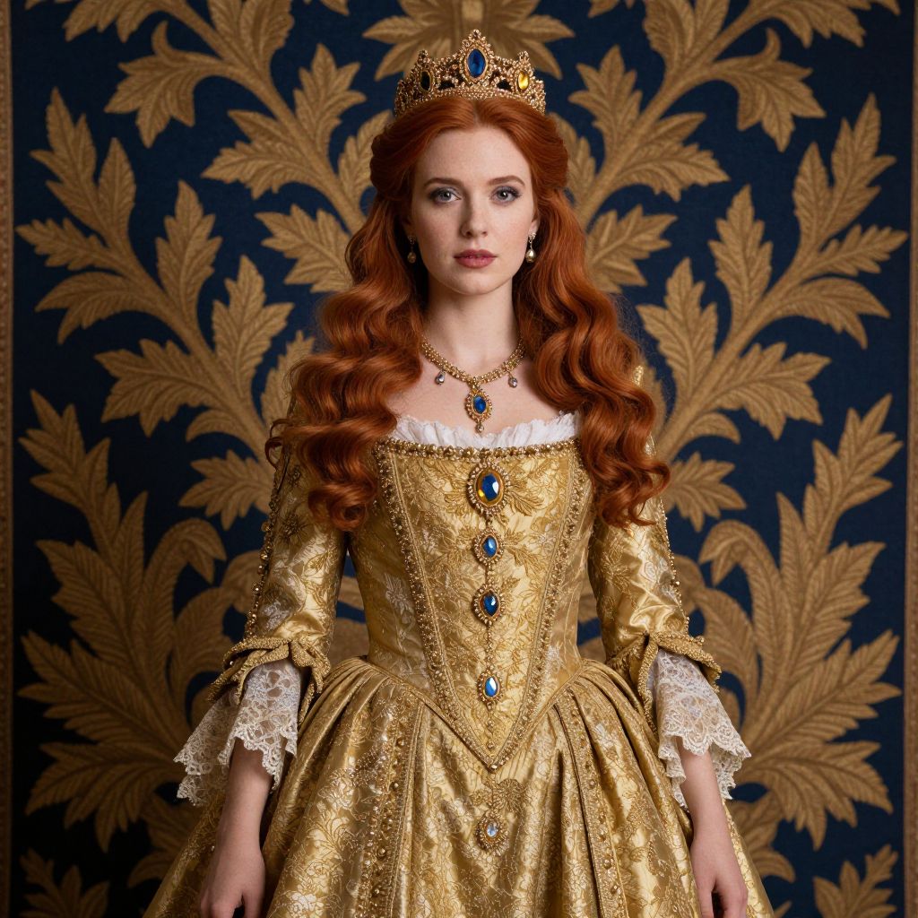 Elegant portrait of a woman adorned in regal attire, featuring a golden gown embellished with intricate lace and jewels, complemented by a crown atop her flowing red hair, set against a richly detailed backdrop of gold foliage on a deep blue tapestry.
