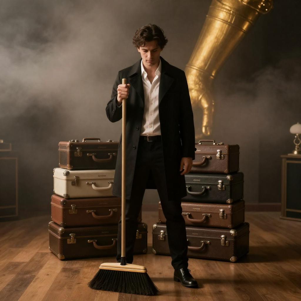 A man with dark hair, wearing a black coat, white shirt, and black pants, holds a broom and stands in a dimly lit room. He is positioned in front of stacked suitcases labeled "CARTIER GATLING" and "MARK". Smoke or fog fills the background, partially obscuring a large, ured, golden arm. The man's expression is focused. The room has wooden flooring and warm, yellow lighting. The man is the primary subject, centered in the image.