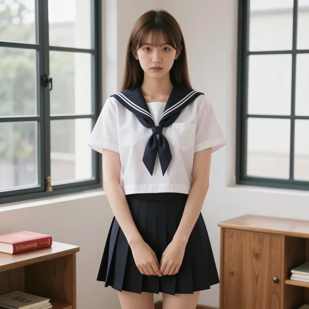 Young woman with long brown hair and cat ear headband, wearing white blouse with red bow, navy skirt, and white thigh-high stockings. Sitting on bed with white sheets, legs crossed, hands on thigh. Neutral facial expression. Bedroom with white curtains and brown curtains in background. "CKS JAPAN" in center.