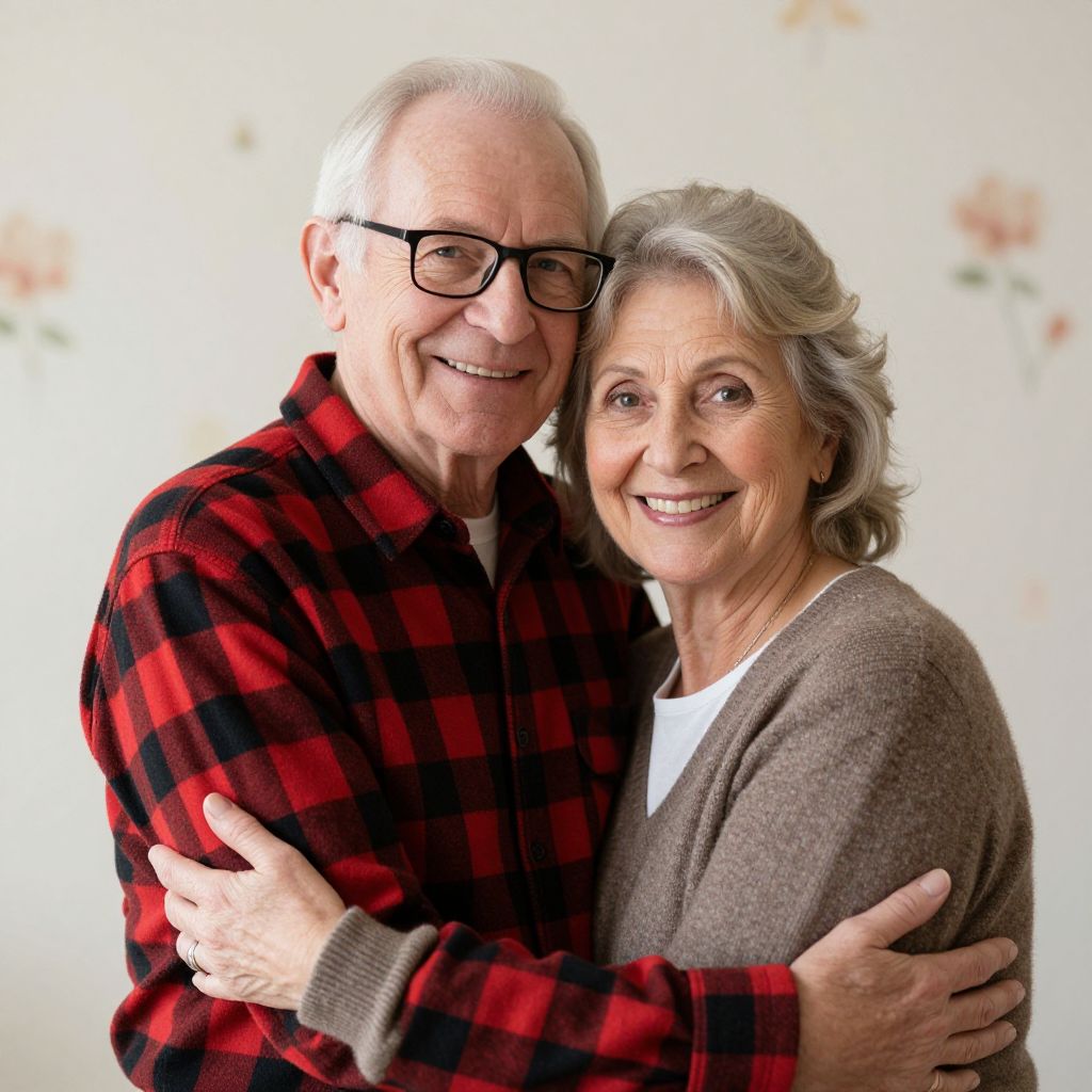 Smiling elderly couple sharing a warm embrace, with the man wearing a red-and-black plaid shirt and glasses, and the woman dressed in a brown sweater over a white top, both exuding a sense of contentment and companionship against a softly lit background adorned with subtle floral patterns.