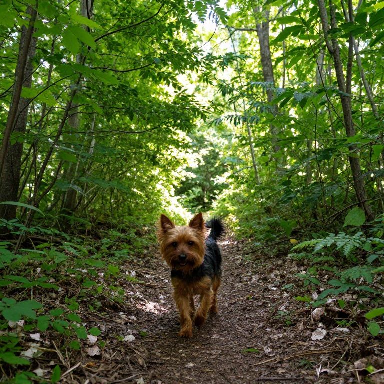 Happy Yorkie Pinscher mix exploring a forest trail, surrounded by lush green foliage, sun beams piercing through the trees, fur texture realistic with slight wind movement, wide angle lens perspective, immersive nature scene