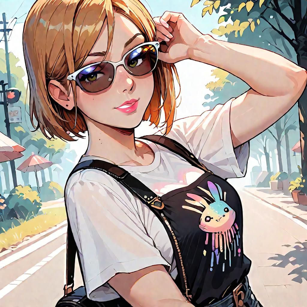 Score_9, score_8_up, score_7_up, source_anime, solo, 1girl, kugisaki nobara, smile, looking at viewer, sunglasses, white shirt, off-shoulder shirt, short sleeves, jeans, shoulder bag, outdoors