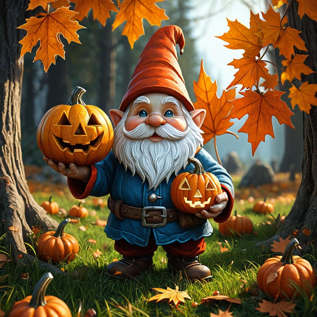 Cute gnome with a white beard and red pointed hat holding two carved pumpkins in an autumn forest. Surrounded by orange maple leaves, pumpkins on the grass, and warm sunlight filtering through trees. High detail with vivid colors and volumetric lighting enhancing the seasonal atmosphere.