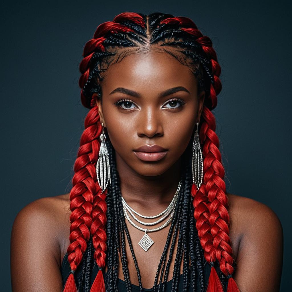 Orange braids dark skin,1girl, solo, jewelry, necklace, dark skin, dark-skinned female, realistic, dreadlocks, earrings, lips, long hair, very dark skin, multiple braids, looking at viewer, brown eyes, upper body