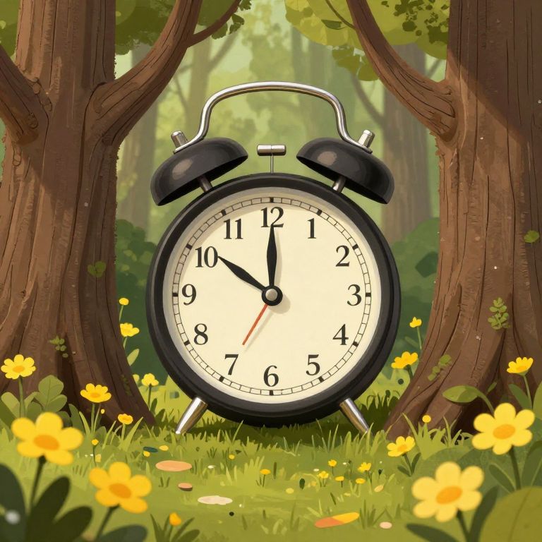 Digital illustration of a black, twin-bell alarm clock with black hands, standing on grassy forest floor, surrounded by yellow flowers and tall trees with