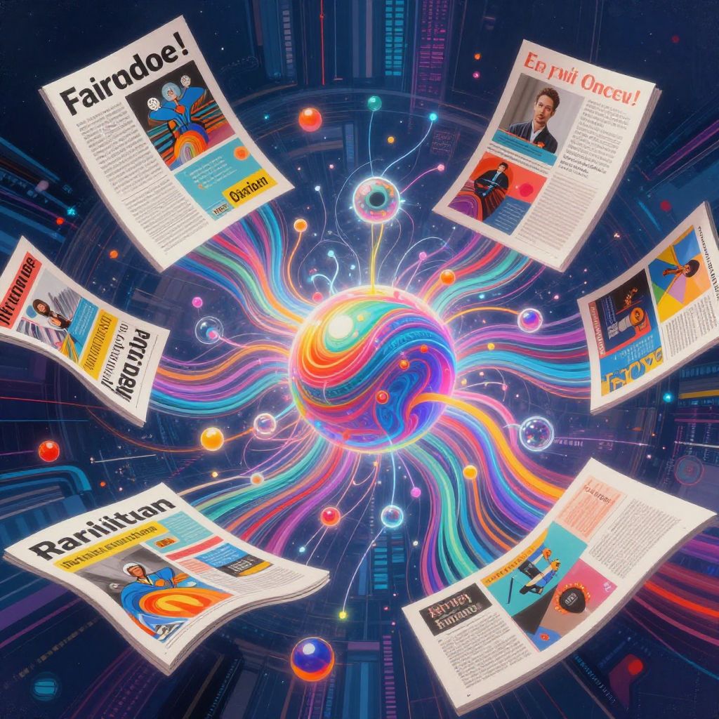 Ai magazine generator abstract concept, neural network nodes creating colorful magazine designs, swirling data streams and text blocks, bright digital colors with glowing effects, high-tech abstract environment, representing creative AI technology in publishing, fine art digital painting