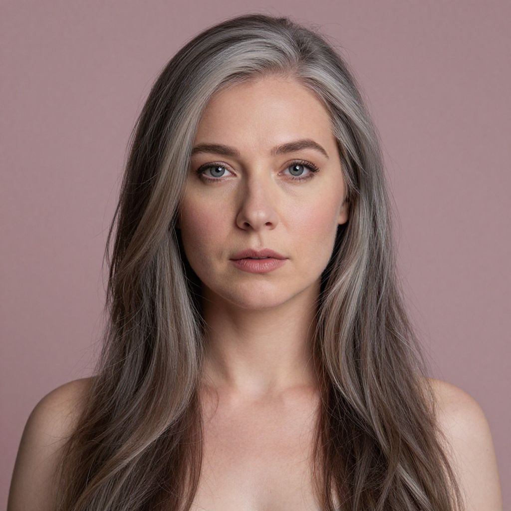 Photograph of a young Caucasian woman with long, straight, silver-gray hair that has subtle dark brown highlights. She has fair skin, light blue eyes, and natural-looking makeup with a slight pink lip. Her expression is neutral, with a slight hint of seriousness. She is bare-shouldered, suggesting she may be wearing a strapless top or nothing at all. The background is a solid, muted pink color, which contrasts with her hair and skin tone. The lighting is soft, highlighting her facial features and hair texture. The image focuses on her head and shoulders, capturing a realistic and natural portrait style.