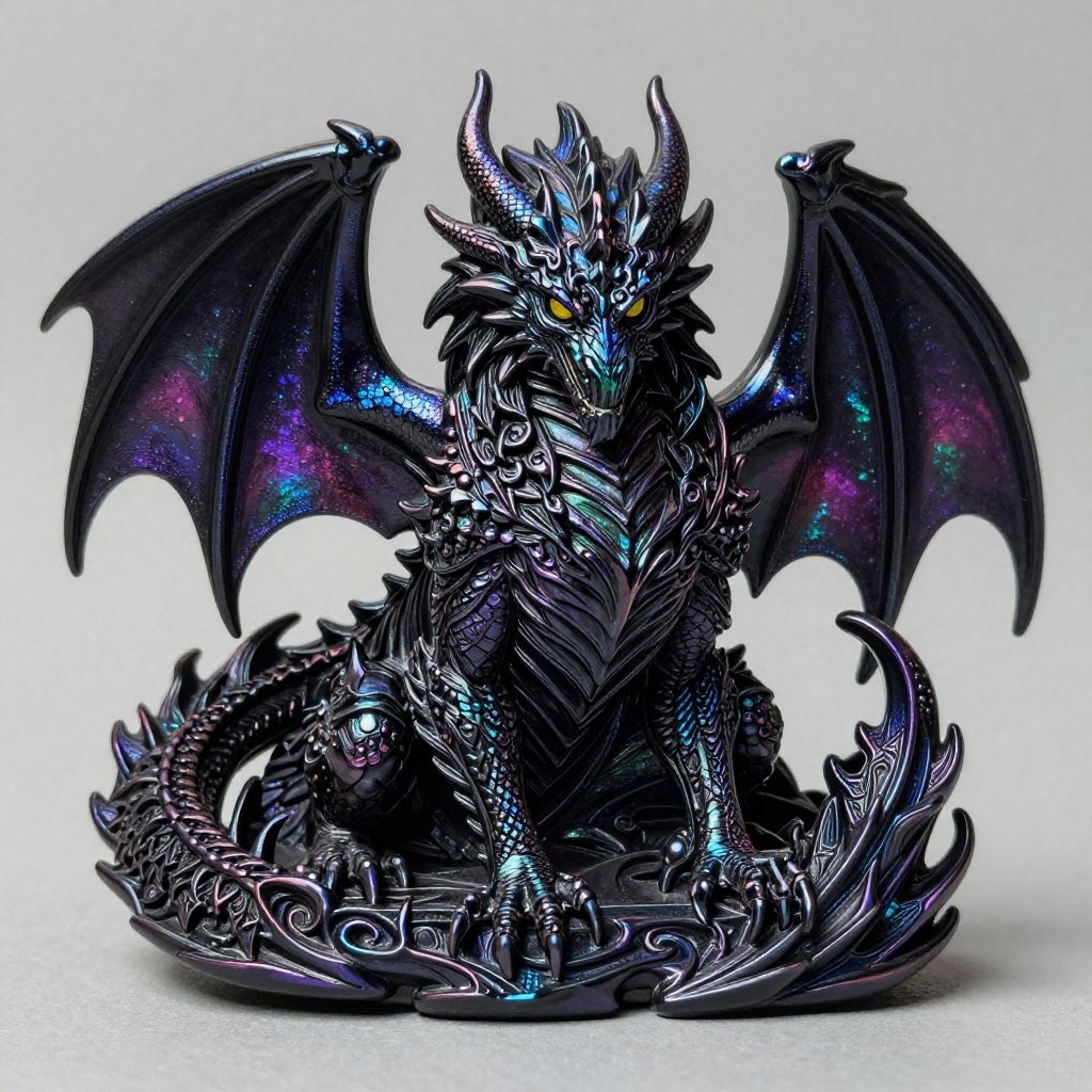 Photograph of a highly detailed, black metallic dragon figurine with intricate scales and spikes. The dragon has large, outstretched wings adorned with a glowing, starry pattern in shades of blue, purple, and green. Its head is adorned with sharp horns, and its eyes emit a subtle blue glow. The dragon sits on a circular, ornate base with swirling patterns. The background is plain white, highlighting the dragon's metallic texture and cosmic wing accents. The dragon's pose is majestic and slightly turned to the side, showcasing its detailed craftsmanship.