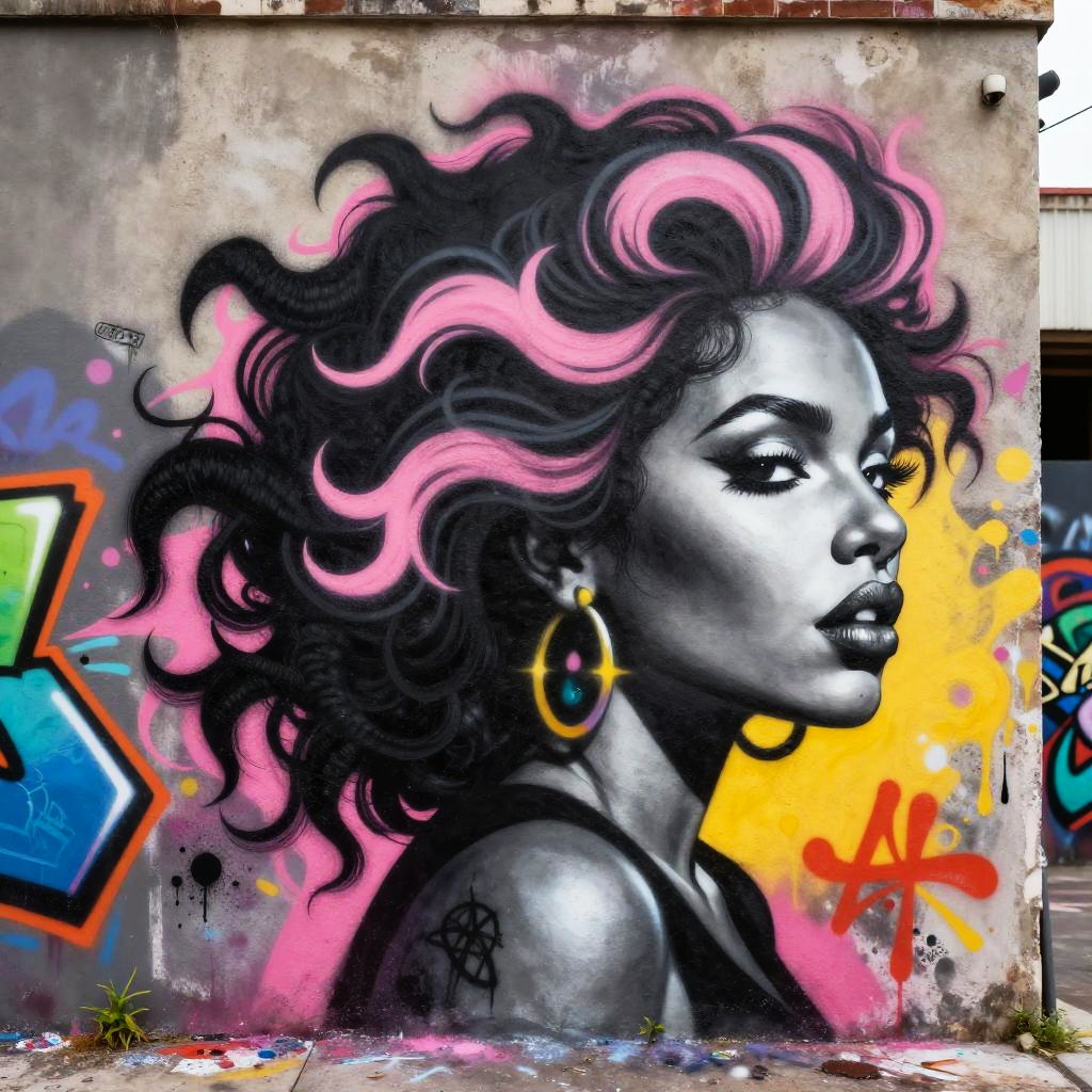 Street art mural depicting a figure with flowing black and pink curly hair intertwined with graffiti elements, vibrant urban textures, energetic composition, colorful spray paint effects, contemporary pop art style.