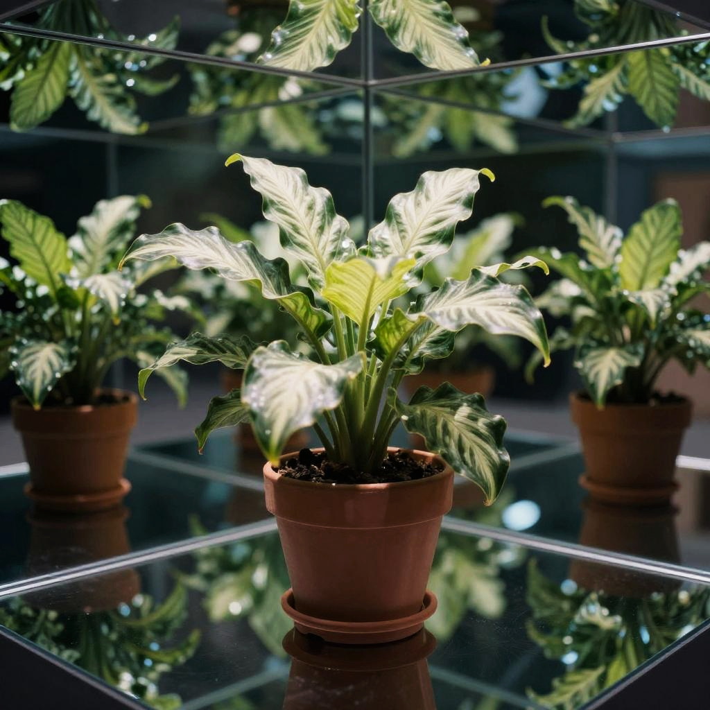 Cinematic anamorphic psychedelic (hasselblad┬з:1.2) potted plant on black reflective glass with mirrors and infinite refractive loops, extremely detailed, 8k, 35mm photograph, amazing natural lighting, brilliant composition, symmetrical pattern