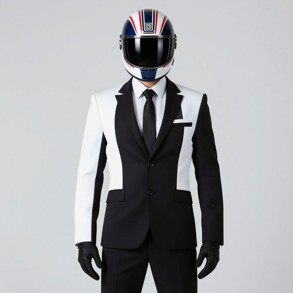 Photograph of a mannequin wearing a sleek, modern, black and white suit with a black tie. The suit features a bold, white, diagonal stripe pattern on the sleeves and body. The mannequin also wears a black helmet with a reflective visor and red, white, and blue stripes on top. Black gloves cover the mannequin's hands. The background is a clean, white gradient, highlighting the sharp, futuristic style of the outfit. The overall aesthetic is minimalistic and high-contrast, emphasizing the suit's modern design.
