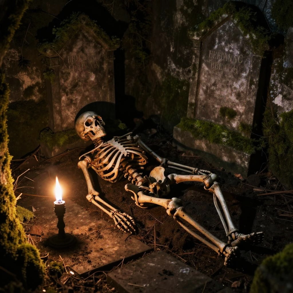 Dug up grave body in abandoned crypt, dirt scattered on cold stone floor, flickering torchlight casting shadows on skeletal remains, moss-covered walls, mysterious and somber scene