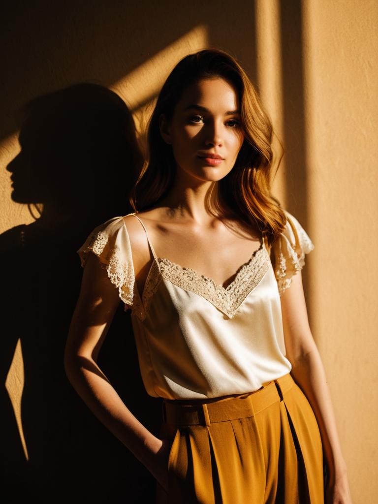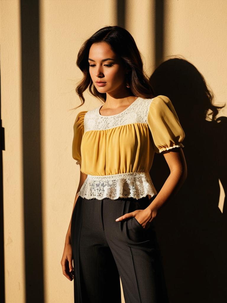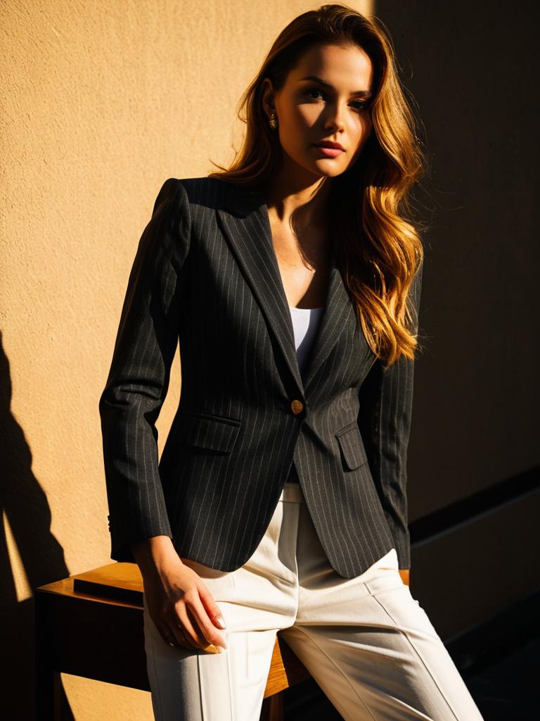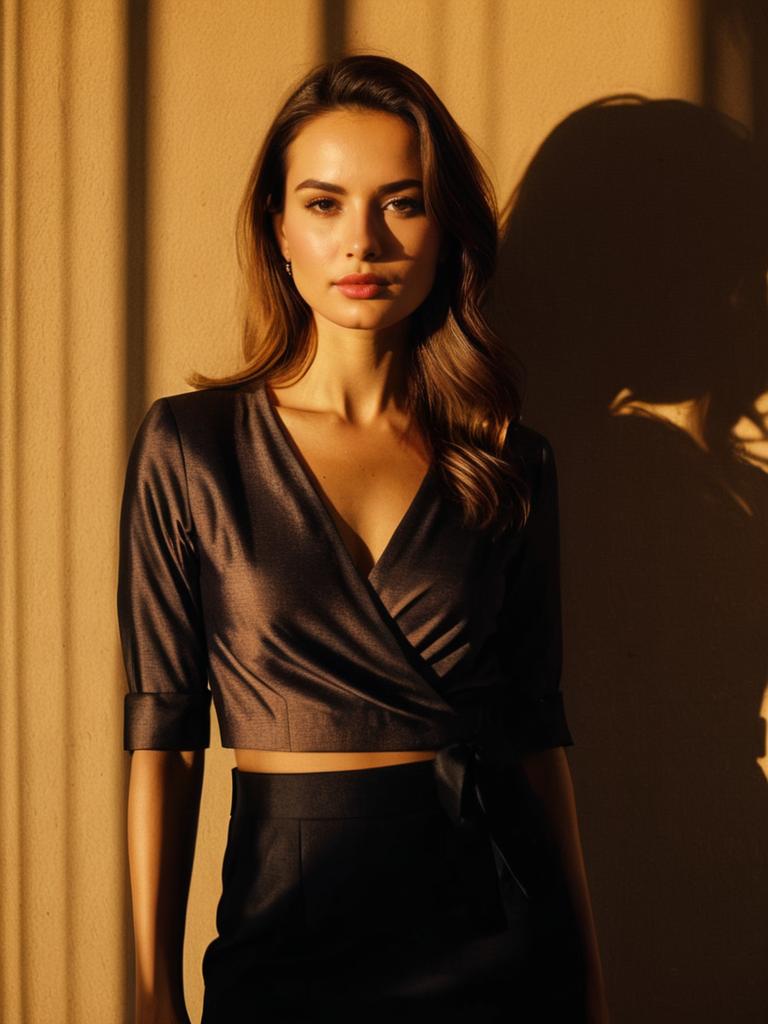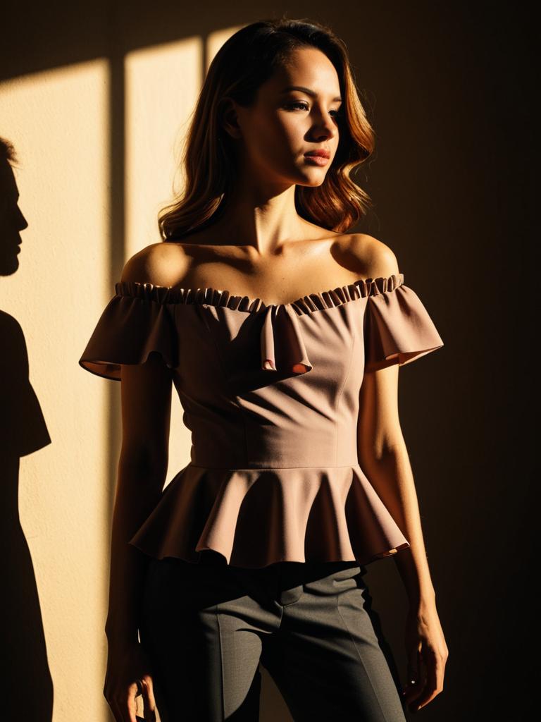Woman, contemporary chic, navy blue off-shoulder knit top, three-quarter length loose sleeves, scoop neckline, wine red pleated midi skirt, studio background --sref 1393