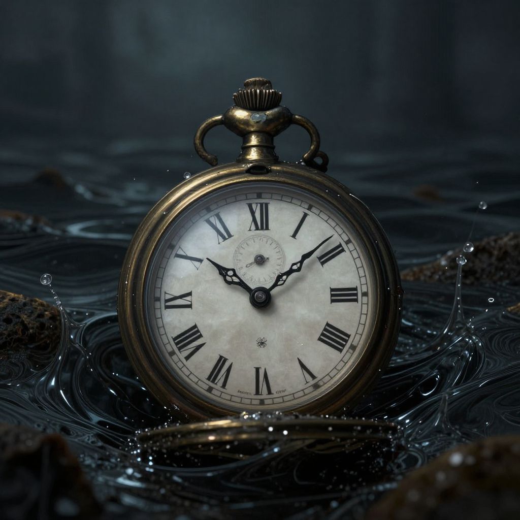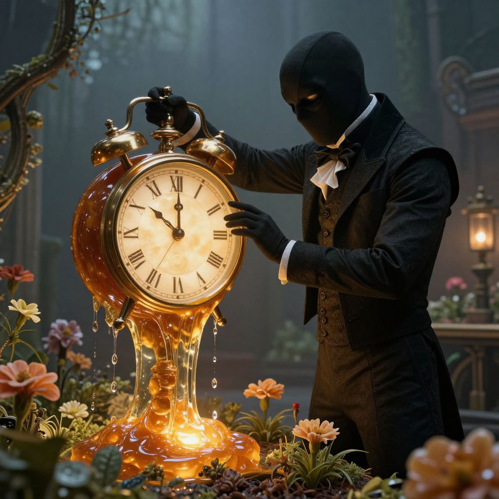 In a surreal, cyberpunk-inspired digital artwork, a cloaked figure in a Victorian waistcoat meticulously tends to a glowing, honey-like clock that blooms and cascades like a garden, symbolizing the precise manipulation of time through surgical precision and otherworldly elegance.