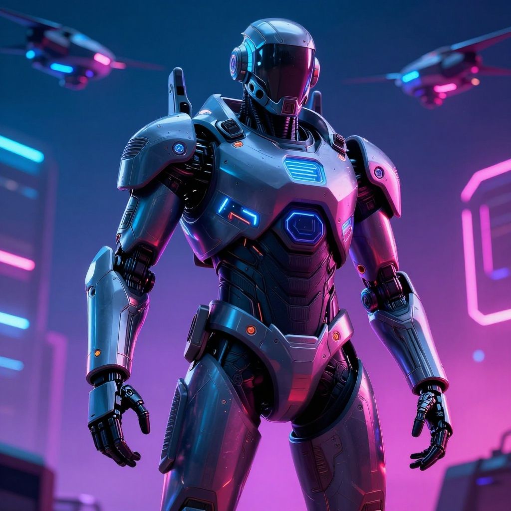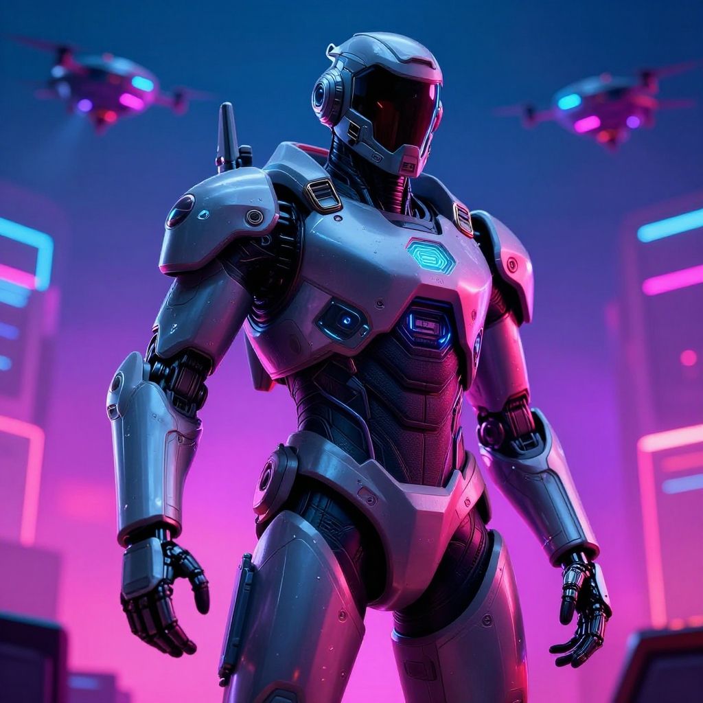 Futuristic soldier in high-tech cybersuit, detailed mechanical joints and illuminated panels, dystopian background with flying drones, vibrant neon colors