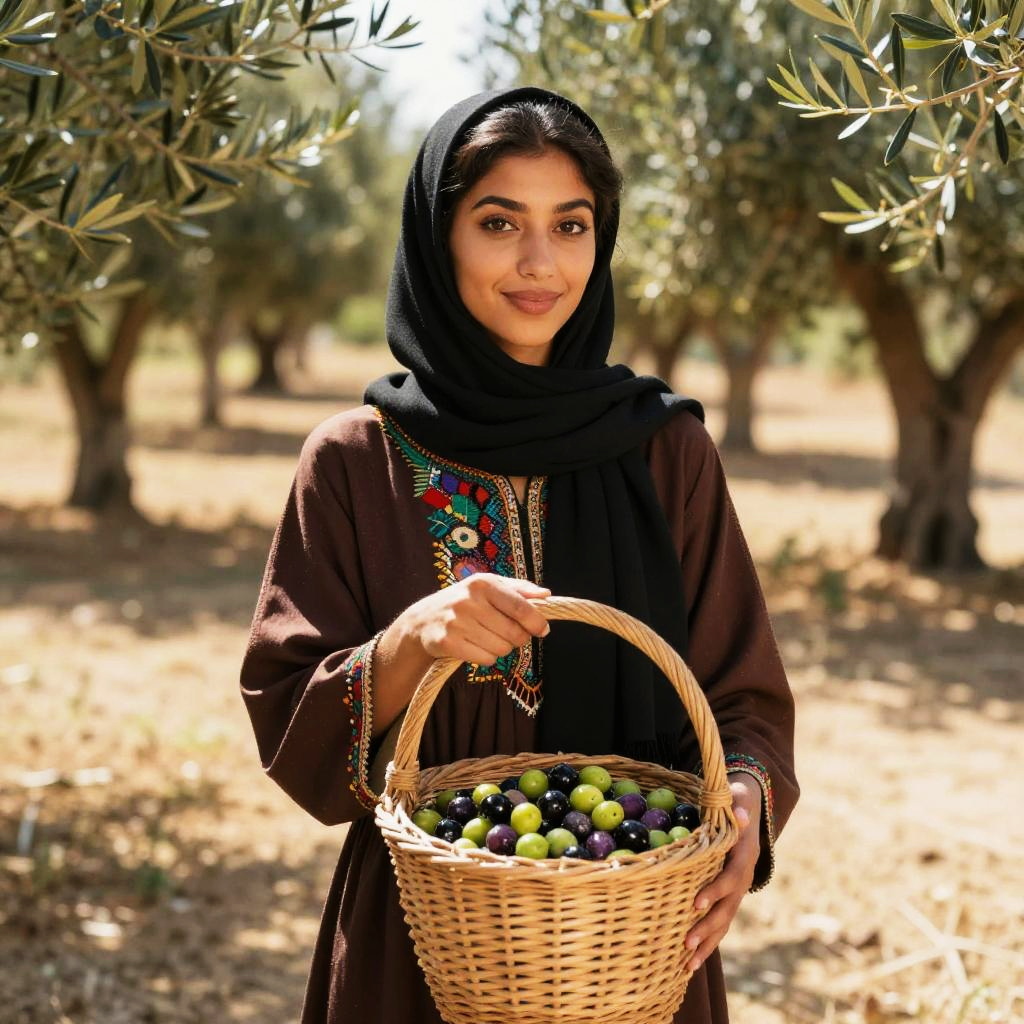 Portrait of a young Middle Eastern woman with medium brown skin and dark eyes standing in an olive grove. She is wearing a black headscarf and a brown dress adorned with colorful, intricate embroidery on the neckline and cuffs. She holds a wicker basket filled with green, black, and purple olives. Sunlight softly filters through the olive trees, casting dappled shadows on the dry, sandy ground.