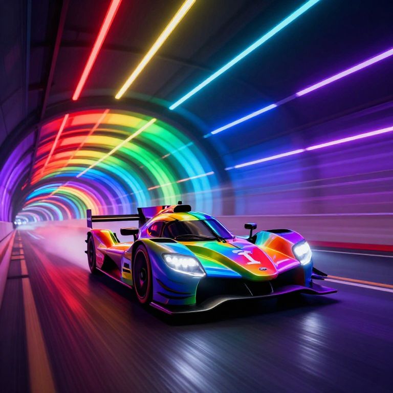 The image depicts a dynamic, high-energy scene of a race car with a bright \"1\" on its side, speeding through a tunnel of glowing, multicolored lights. The car, a sleek, aerodynamic vehicle with a vibrant, rainbow-colored body, is captured in motion, emphasizing its speed and efficiency. The tunnel is a spectacle of light, with a spectrum of colors including red, yellow, green, blue, and purple, creating a mesmerizing visual effect. The lights appear to be streaking past the car, enhancing the sense of motion and speed. The overall composition is balanced, with the car positioned centrally, drawing the viewer's eye through the tunnel. The interplay of colors and shapes creates a sense of depth and movement, making the scene appear almost three-dimensional. The car's design, with its low profile and large rear wing, suggests it is built for high performance and speed. The image is a vivid representation of the power and excitement of racing, with the car and tunnel working together to convey a sense of speed and efficiency.
