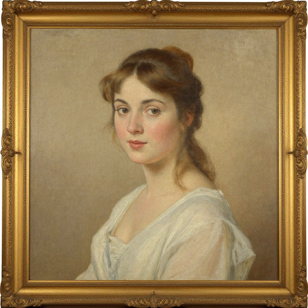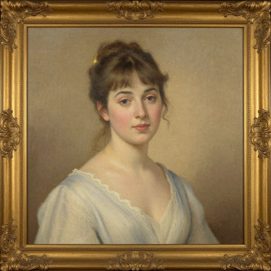 Classical oil painting of a young woman with fair skin, brown hair in a loose updo, wearing a white blouse, in an ornate gold
