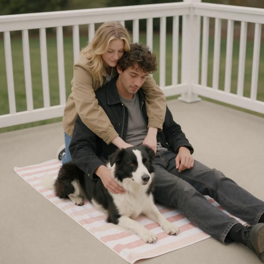 Photograph of a backyard scene with a blonde woman in a white shirt and blue jeans, kneeling among yellow and white flowers, looking at a young man in a black and white striped shirt standing behind her. A white house with a wooden deck is in the background, surrounded by greenery.