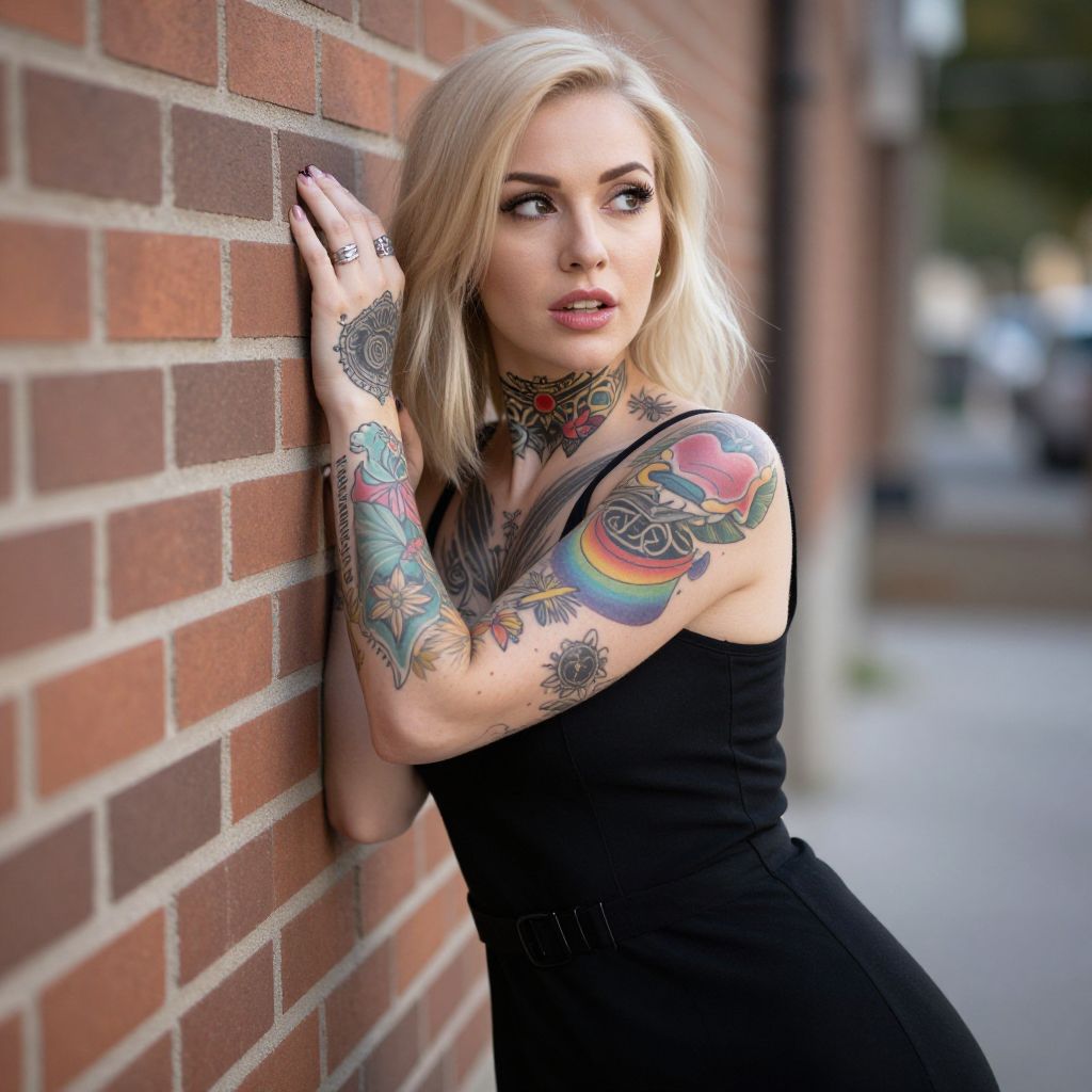 Photograph of a blonde woman with shoulder-length hair, leaning against a brick wall. She's wearing a black, sleeveless dress that reveals extensive, colorful tattoos covering both arms and her neck. Her right hand is raised to her face, and she's looking off to the side with a slightly open mouth. The background is softly blurred, adding depth to the image.