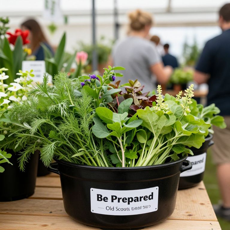 Photograph of a black plastic pot labeled "Be Prepared" with assorted green herbs and small blue flowers, set on a wooden table in a bright,