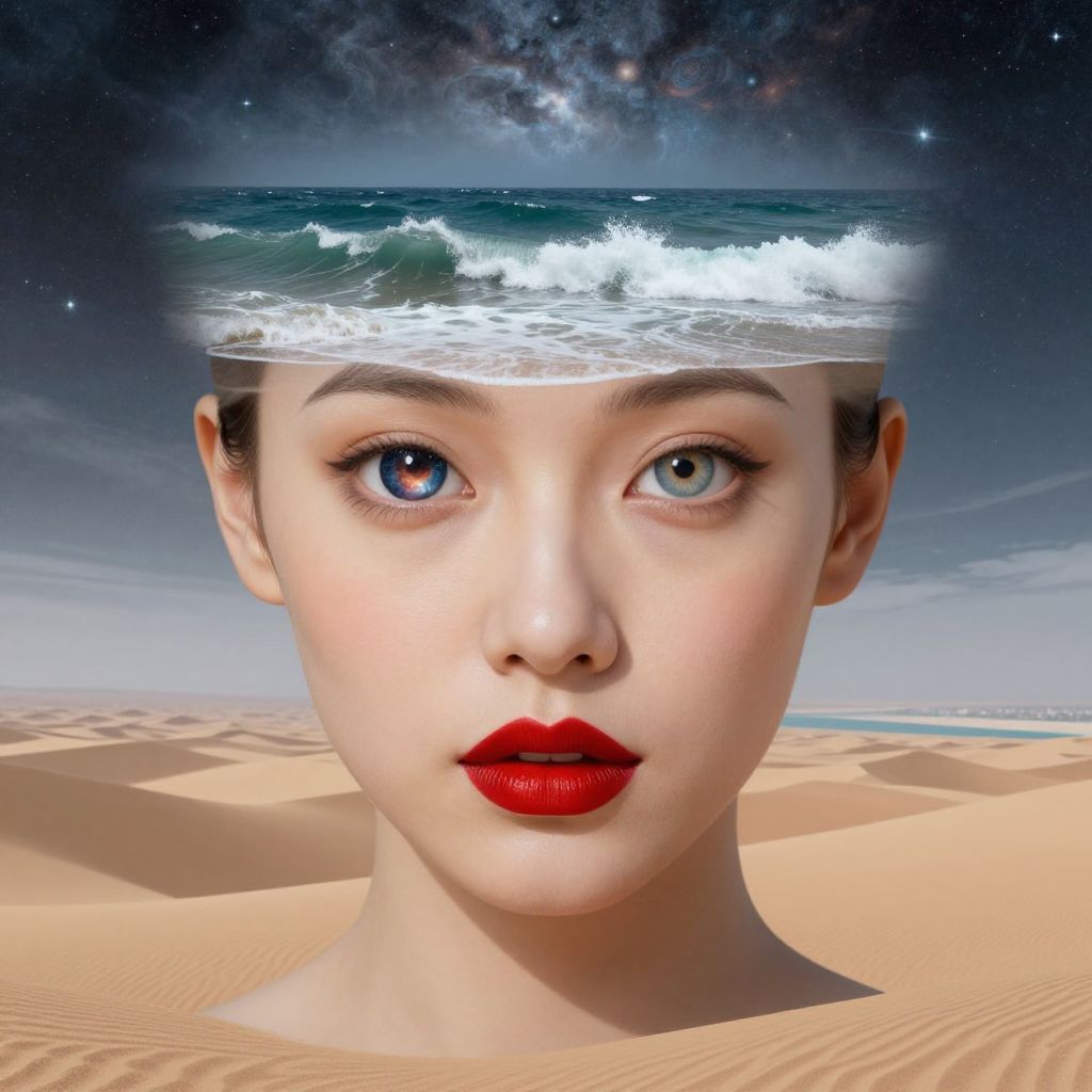 A surreal, hyper-realistic photo of a woman's face seamlessly merging with a dreamlike landscape, Her skin is smooth and porcelain-like, with vibrant red lips adding a striking contrast, One eye is a large, hypnotic orb that reflects a swirling cosmos, containing distant planets and stars, while the other eye is a vast, watchful iris that seems to hold the depths of an ocean within it, The top of her head opens into a vast seascape, with waves crashing against a shore that fades into an endless desert, The desert dunes roll gently beneath her, blending into the curves of her neck and shoulders, The background is divided into surreal quadrants, each representing different natural elements: a stormy sea, an arid desert, a boundless sky filled with planets, and a distant, peaceful coastline, The overall atmosphere is one of mysterious, otherworldly beauty, where the boundaries between human, nature, and the cosmos are blurred, creating a captivating and enigmatic visual experience