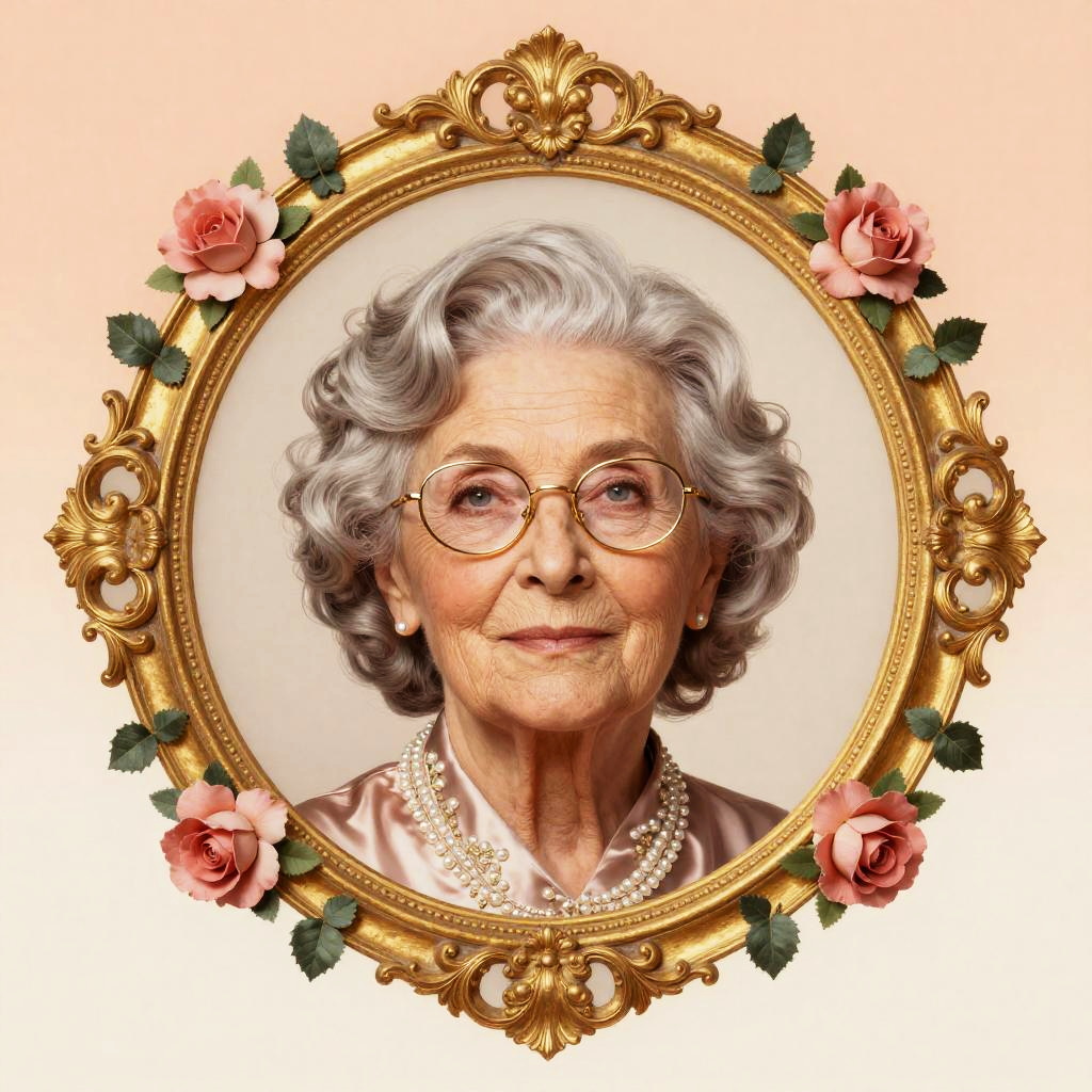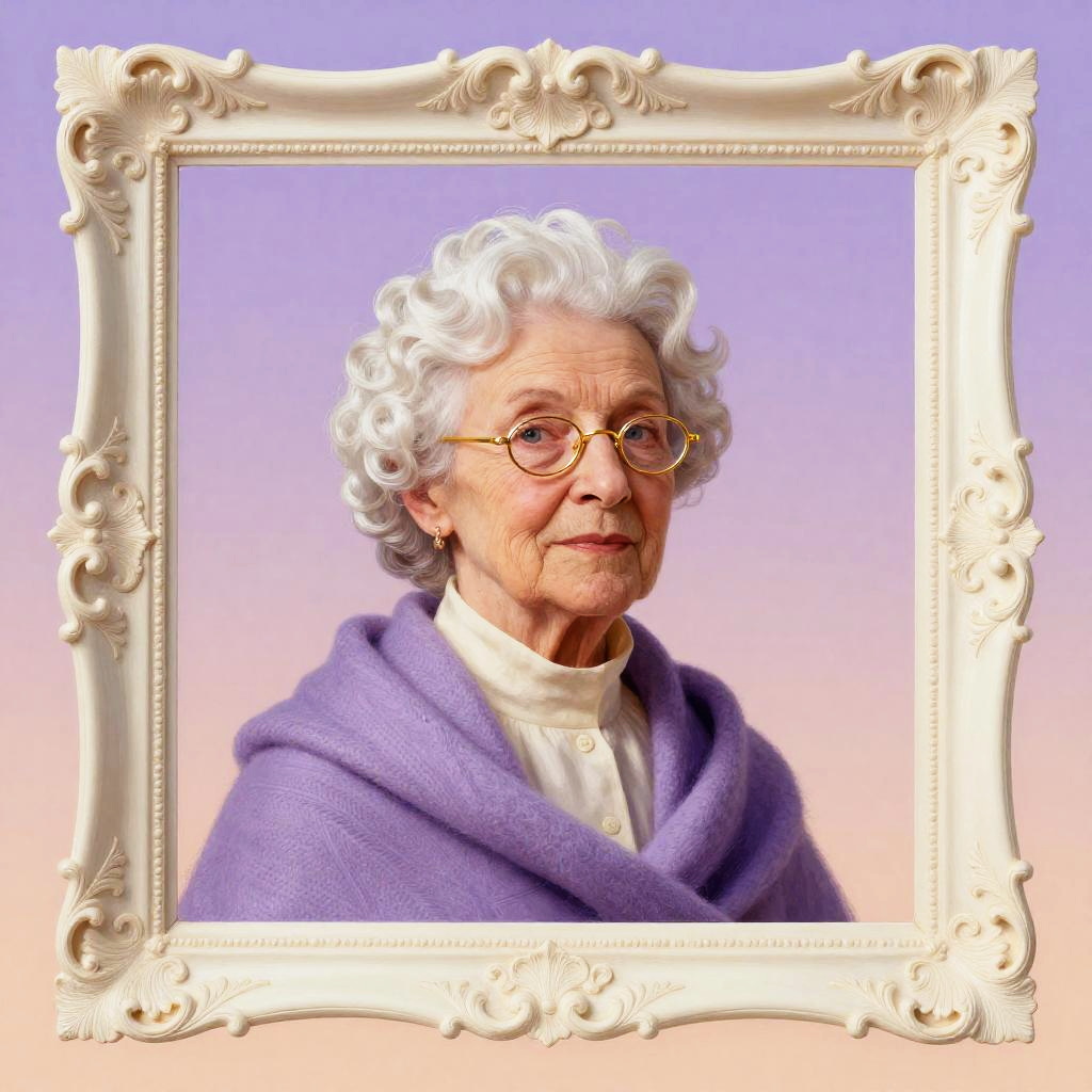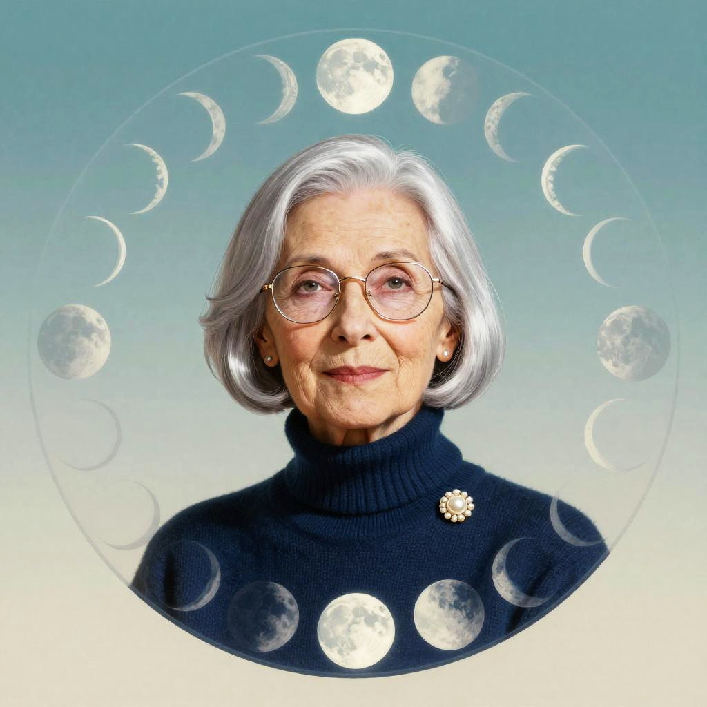 This digital artwork features a stylized portrait of elderly woman with sleek silver bob and thin wire-rimmed glasses, centered within a circular frosted glass frame etched with moon phases. A soft gradient background in harmonious teal and cream, gentle vignette, balanced symmetry. Wearing an elegant navy cashmere turtleneck with pearl brooch. Modern and colorful fusion of folk art and contemporary design; crisp edges, subtle paper grain, painterly accents, high detail, studio quality.