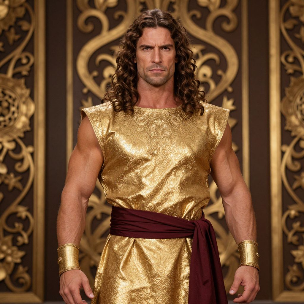 A muscular man dressed in an ornate golden ancient-style robe with intricate embroidery, complemented by a deep red sash and multiple gold bracelets, stands confidently in a historical architectural setting. His intense expression and long, wavy hair enhance the dramatic and heroic vibe of the image, evoking a classical or mythological warrior theme.
