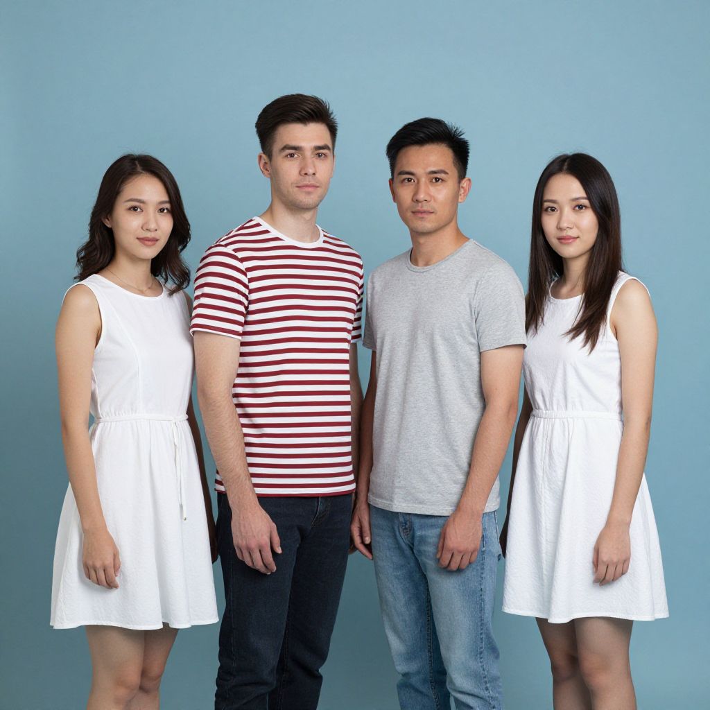 Four individuals stand together in a composed group portrait, featuring two men and two women dressed in casual attire, with one man wearing a red-and-white striped shirt and another in a gray t-shirt, while the women wear white dresses, set against a plain blue background with soft lighting and subtle shadows.