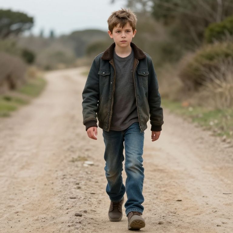 Photograph of a young boy with tousled brown hair walking down a dirt path. He wears a black jacket with dark gray stripes, a gray t-shirt, blue jeans, and brown shoes. His expression is neutral, and he looks directly at the camera. The background features a blurred, wooded area with green and brown foliage on either side, and a light-colored, gravelly path stretching into the distance. The overcast sky suggests a cloudy day. The boy is centered in the frame, with natural light highlighting his figure against the muted background.