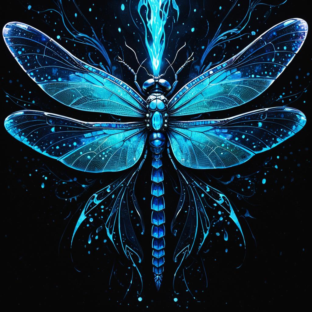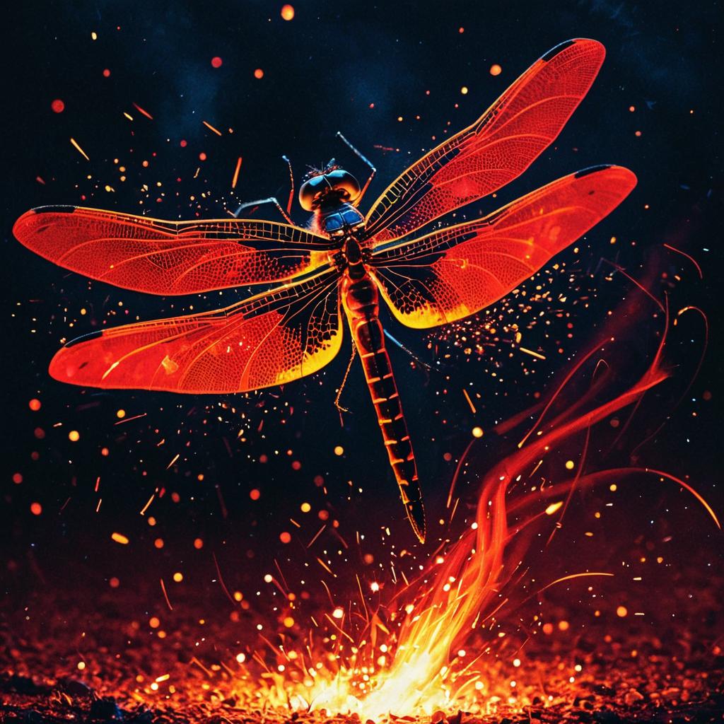 Fire painting of a blazing dragonfly against a crimson twilight, featuring intense heat effects and swirling sparks in a magical atmosphere.