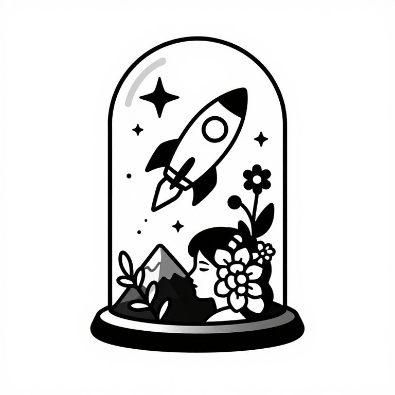 Sculptor Tattoo design on a white background. Rocket aiming for the stars inside glass dome::5 Illustrative, Black and white::4 flowers, floral, face, person, mountains::-2,