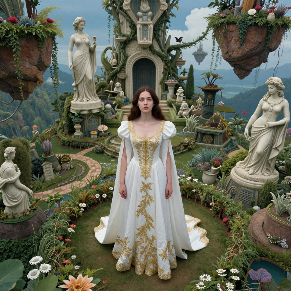 Digital artwork: Pale-skinned woman in white, gold-embellished gown stands center of whimsical, fantasy garden with marble statues, lush plants
