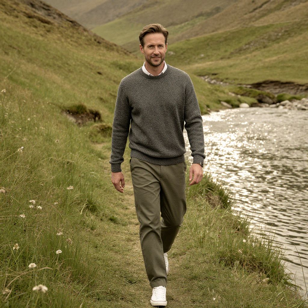 Photograph of a Caucasian man with short brown hair and a trimmed beard, walking along a grassy riverside path. He is wearing a dark gray, textured sweater with a white collar shirt underneath, olive green pants, and white sneakers. The background features rolling green hills and a small, reflective river to his right. The grass is dotted with small white flowers, and the path is slightly uneven. The man's expression is neutral, and he is looking directly at the camera. The scene is outdoors, with natural light creating a serene atmosphere.