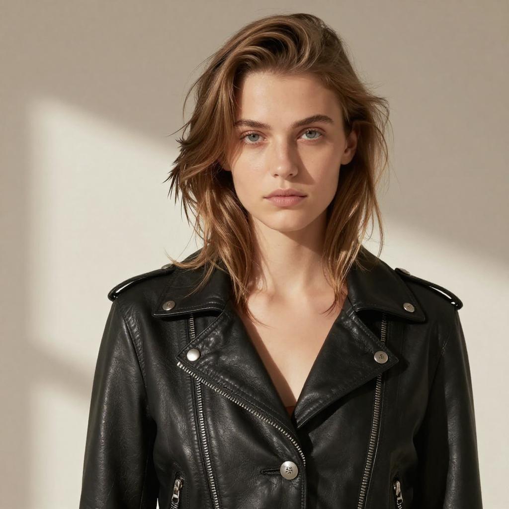 Portrait of a young Caucasian woman with feathered layers hairstyle, wearing a sleek black leather jacket, photographed in a studio setting with warm daylight. The model has light brown hair with subtle highlights and a neutral expression, showcasing a modern fashion editorial look.