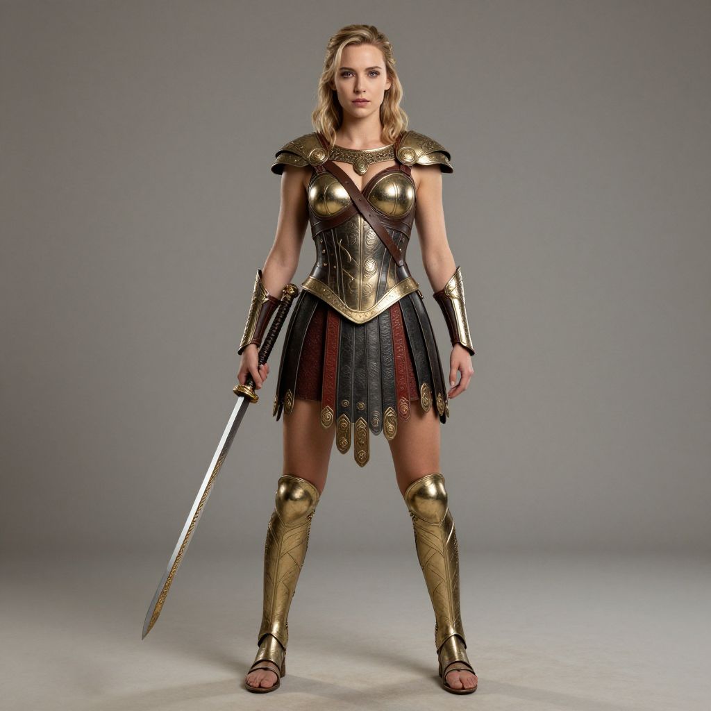 Photograph of a blonde woman in ancient Greek-style armor, holding a sword, with gold accents, black and red pleated skirt, and sandals,