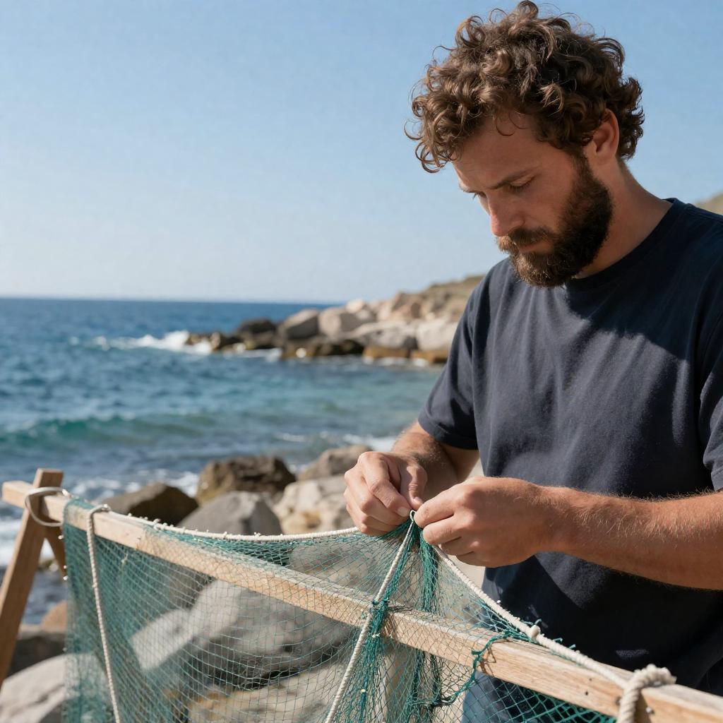 Bearded man with curly brown hair, wearing a dark shirt, concentrating on tying fishing nets by the sea. Background: blue ocean, rocky coastline, clear sky. Fishing nets in foreground, wooden frame supports them. Man's focused expression. Daylight.