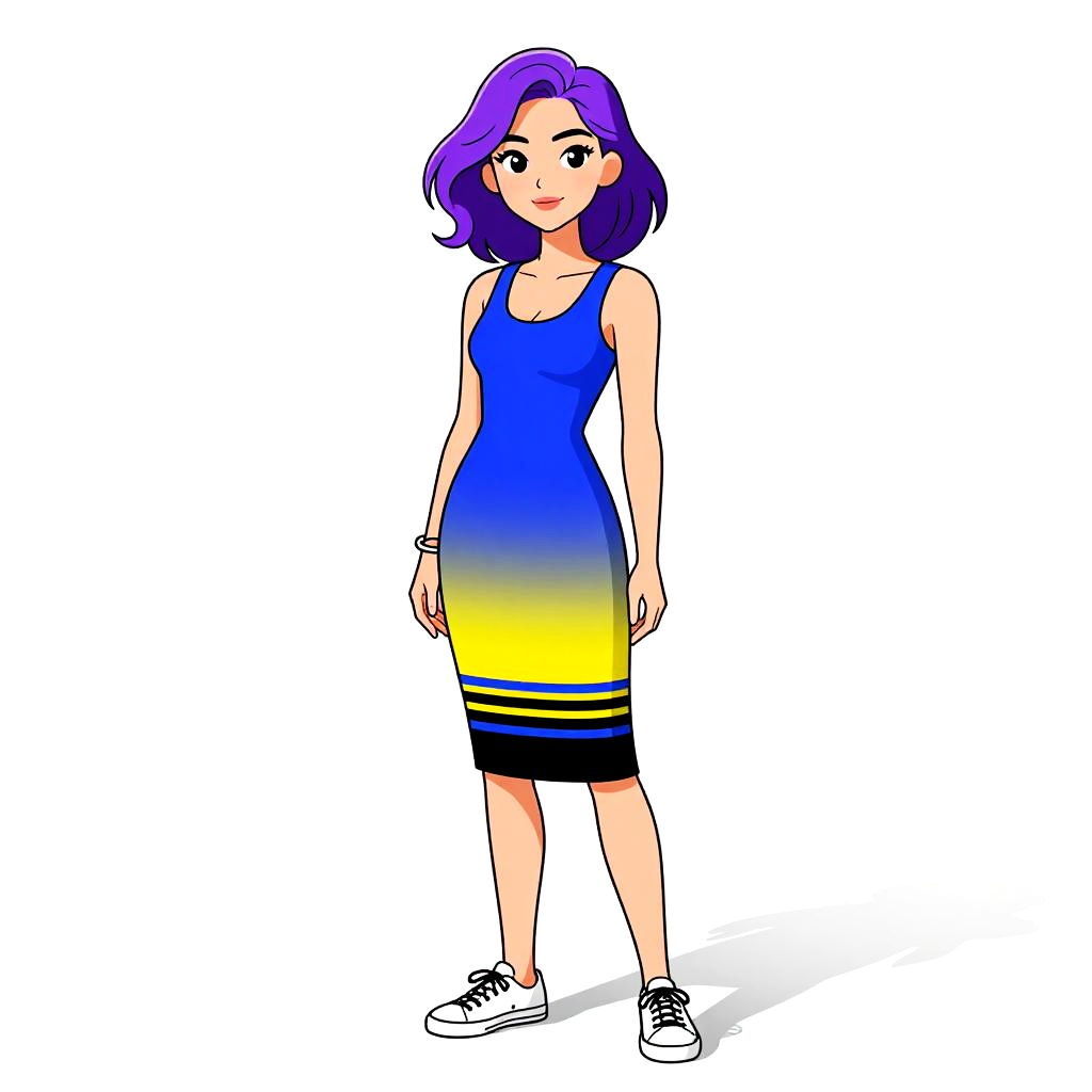 Digital drawing of a purple-haired woman in a gradient blue to yellow sleeveless dress, black and yellow striped hem, white sneakers, standing against a white