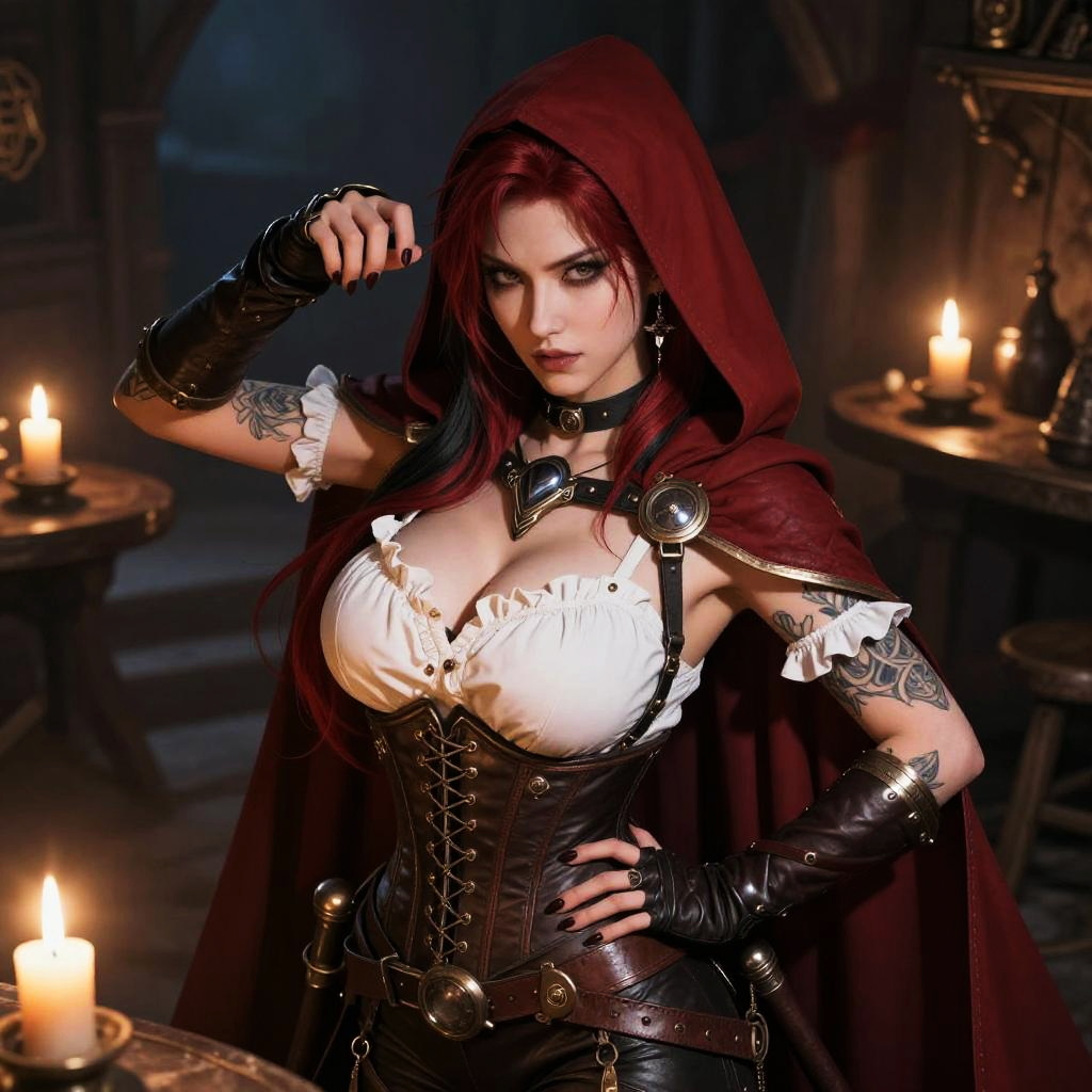 ((a female wearing a red hood)), fantasy theme, medieval, fierce look, ((dynamic poses)), tattoo on her arms, white ruffled sleeve shirt, choker, gloves, corset, leather pants, belt, waist sash, cape, (((masterpiece))), ((best quality)), ((intricate detailed)), ((Hyperrealistic)), a woman with perfect body figure wearing cyberpunk cloth, pale skin, ((huge breast)), highly detailed, illustration, perfect hands, detailed fingers, beautiful detailed eyes, red hair, black hair, multiple color hair, long hair, (fantasy:1.2), armor, detailed background, tavern, night, light by candle, lens flare, tempting look, looking at the viewer, from above