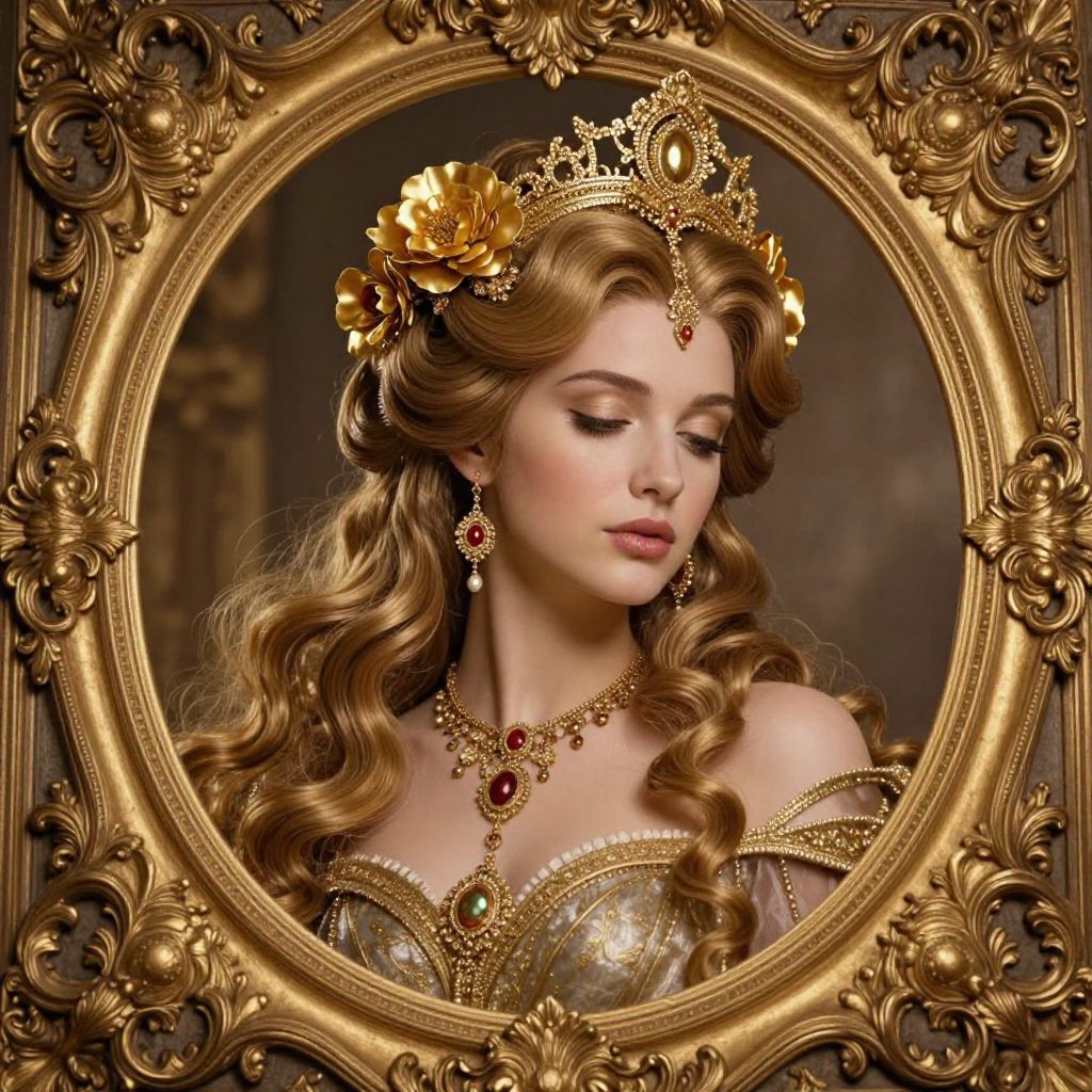 Photorealistic digital artwork of a fair-skinned, young woman with long, wavy, golden-brown hair. She wears an ornate golden crown adorned with a large flower, and a matching golden necklace with a red gemstone. Her off-the-shoulder dress is gold with intricate patterns. She gazes downward with a serene expression. The portrait is framed in an elaborate, ornate gold circular frame with detailed floral designs. The background is a dark, blurred gradient, emphasizing the subject. The overall style is Baroque-inspired, with a focus on opulence and classical beauty.